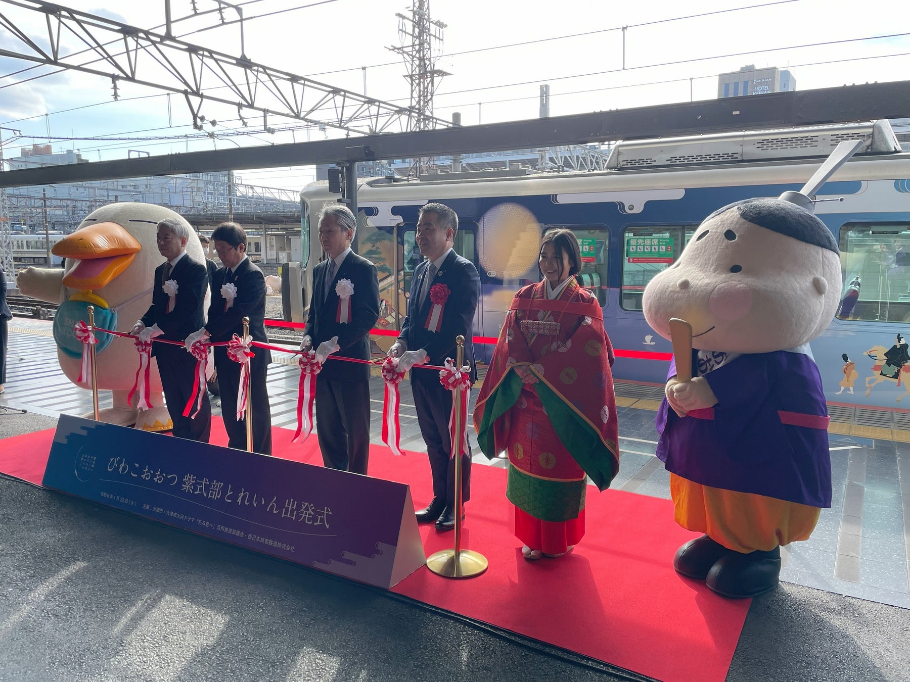 大津市の大河ドラマ「光る君へ」活用推進協議会とJR西日本が協力し、石山詣をテーマにした「びわこおおつ 紫式部とれいん」が運行をスタートしました。