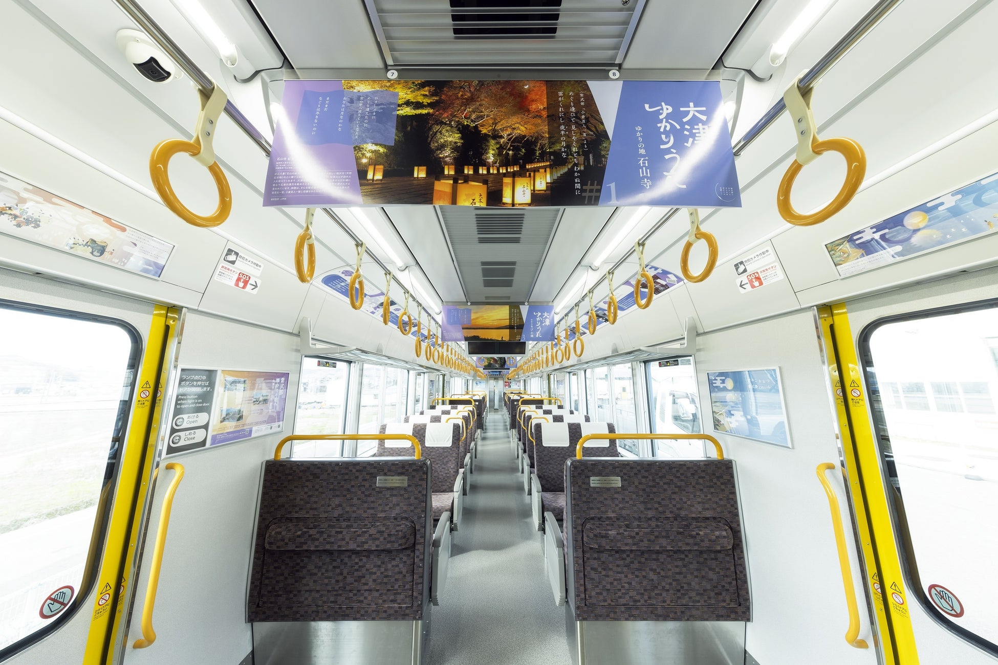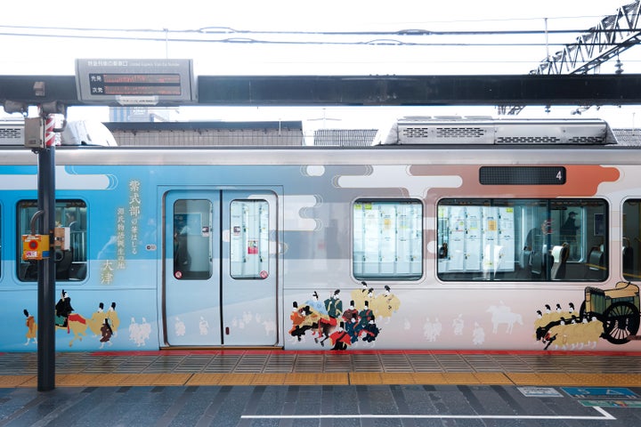 紫式部が石山寺で『源氏物語』を執筆した歴史をラッピング電車で表現しており、車内外には石山詣の様子や紫式部の姿が描かれ、大津の美しい景色や地域の魅力も紹介されています。