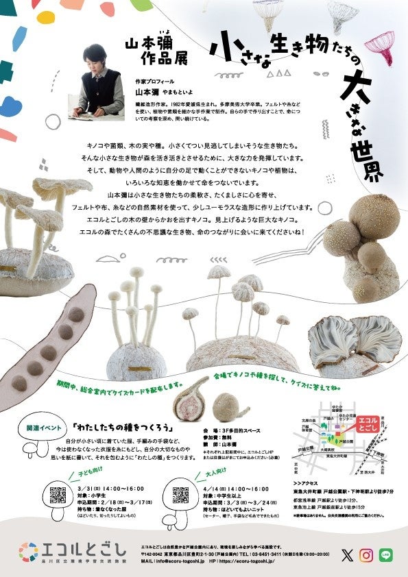 2024年3月26日から4月21日まで、品川区立環境学習交流施設エコルとごしで開催される山本彌作品展「小さな生き物たちの大きな世界」では、自然界のキノコや菌類、木の実、種などに焦点が当てられます。
