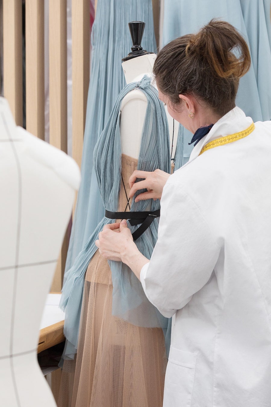ディオールの繊細なプリーツとドレープ技術が光る華やかな装いは、卓越したサヴォワールフェールを感じさせます。