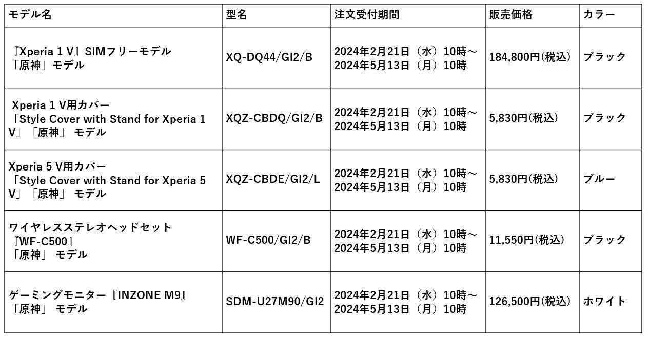 - ソニーマーケティングが「原神」とコラボしたXperia 1 V SIMフリーモデルの注文受付開始