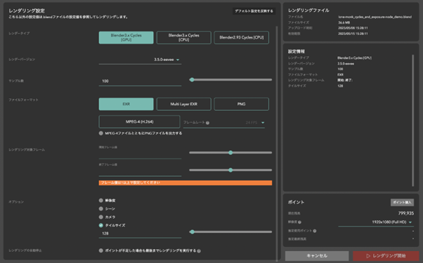 ファイルアップロード後のレンダリング設定画面よりBlender Cycles[GPU]を選択し、レンダーバージョンのプルダウンから、Eeveeを選択してください。