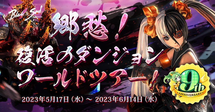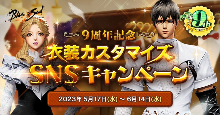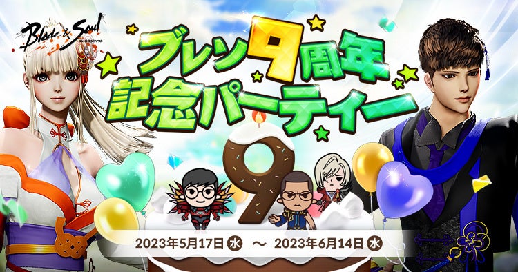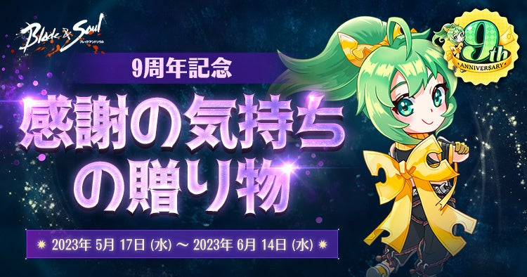 PC向けオンラインゲーム『ブレイドアンドソウル(以下ブレソ)』をサービスしているエヌ・シー・ジャパン株式会社(本社:東京都港区、代表取締役:金 澤憲(キム テクホン)以下、エヌシージャパン)は、2023年5月20日(土)に正式サービス9周年を迎えるにあたり、本日2023年5月17日(水)より9周年を記念した様々なイベントやキャンペーンの開催をお知らせします。