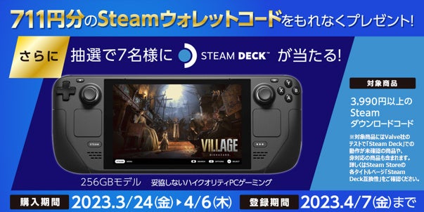 また、キャンペーンも実施中で、対象商品を購入すると711円分のSteamウォレットコードがもらえるほか、抽選で「Steam Deck」が当たります。