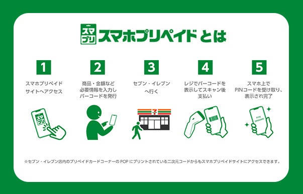 「スマホプリペイド」サイトから商品を選択し、スマホ画面に表示されたバーコードを全国のセブン‐イレブンのレジで提示してお支払いいただくことで、商品ご利用時に使えるPINコードを簡単に購入することができるサービスです。