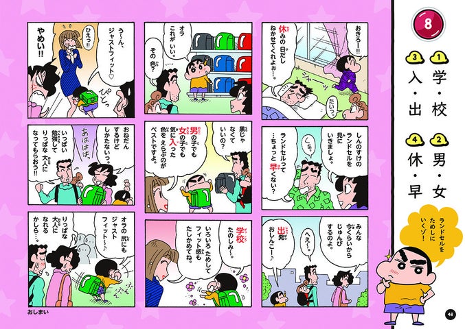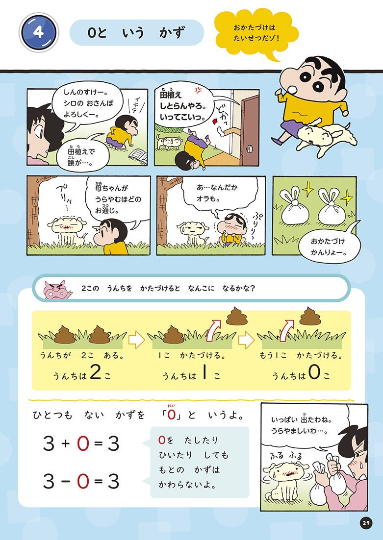 しんちゃんと一緒に楽しく学習できる内容で、漢字や算数をマンガ満載で学べます。