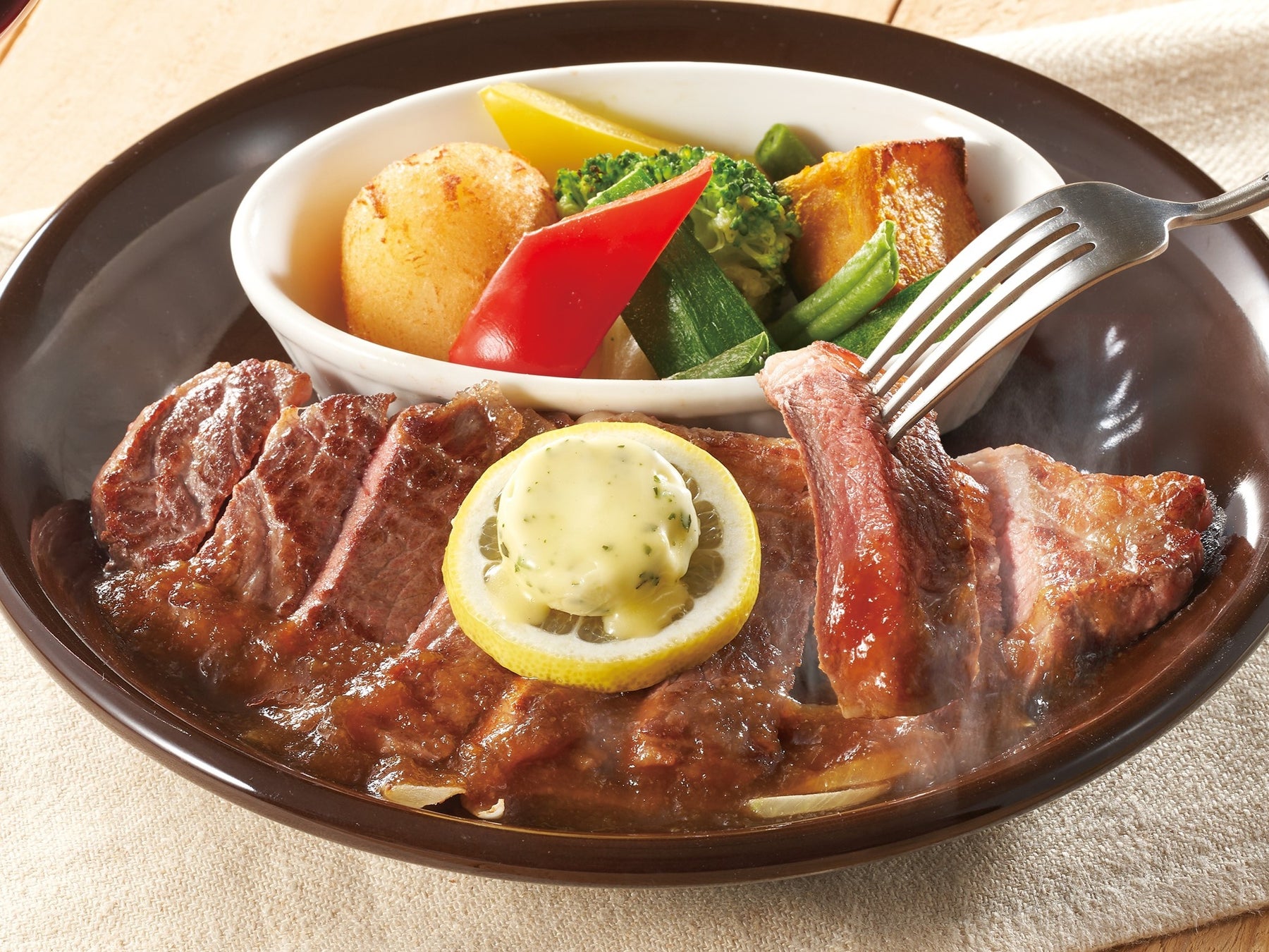 さらに、新登場のUSサーロインステーキは、低温熟成された肉感たっぷりな赤身のステーキやガーリックピラフなどが楽しめます。