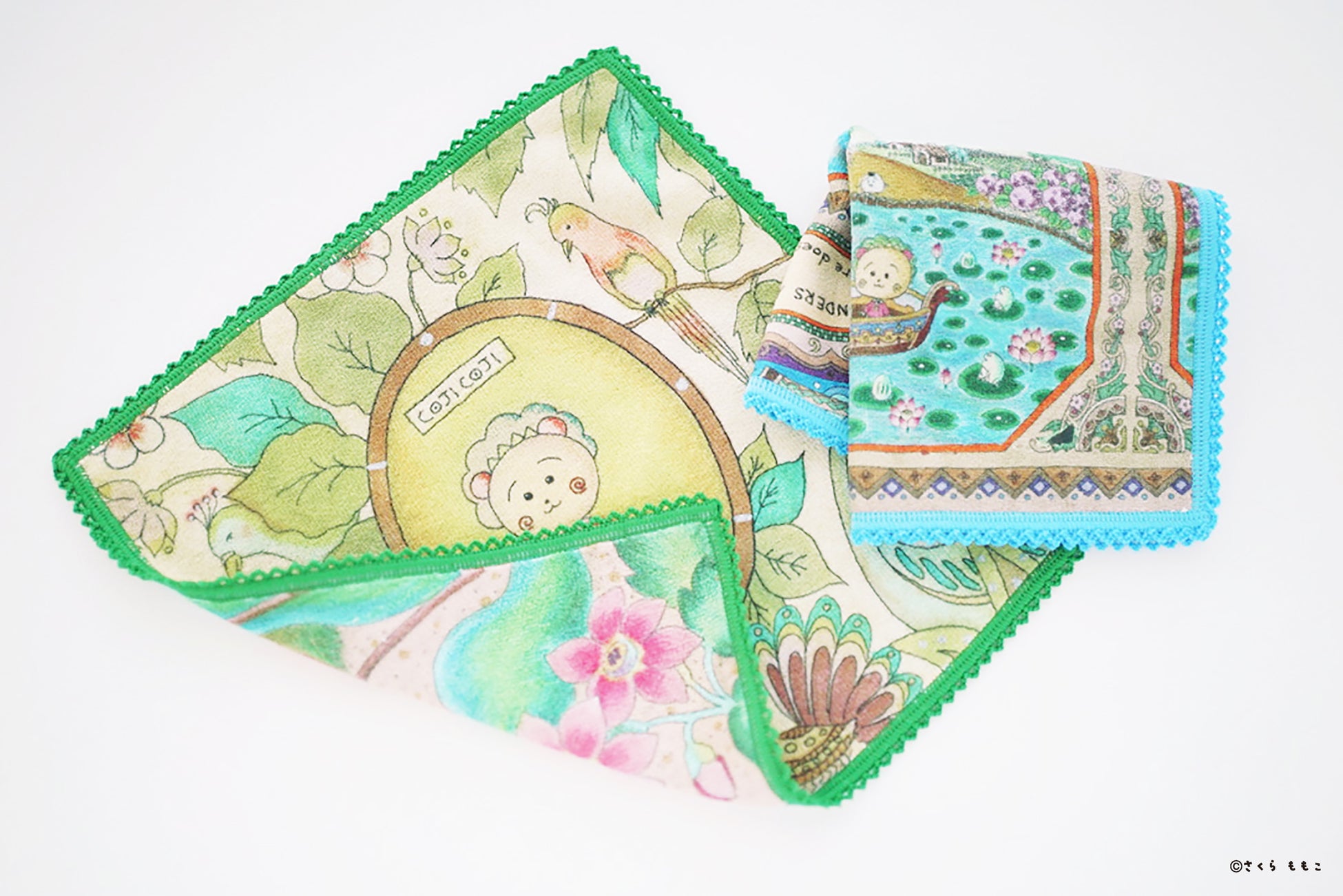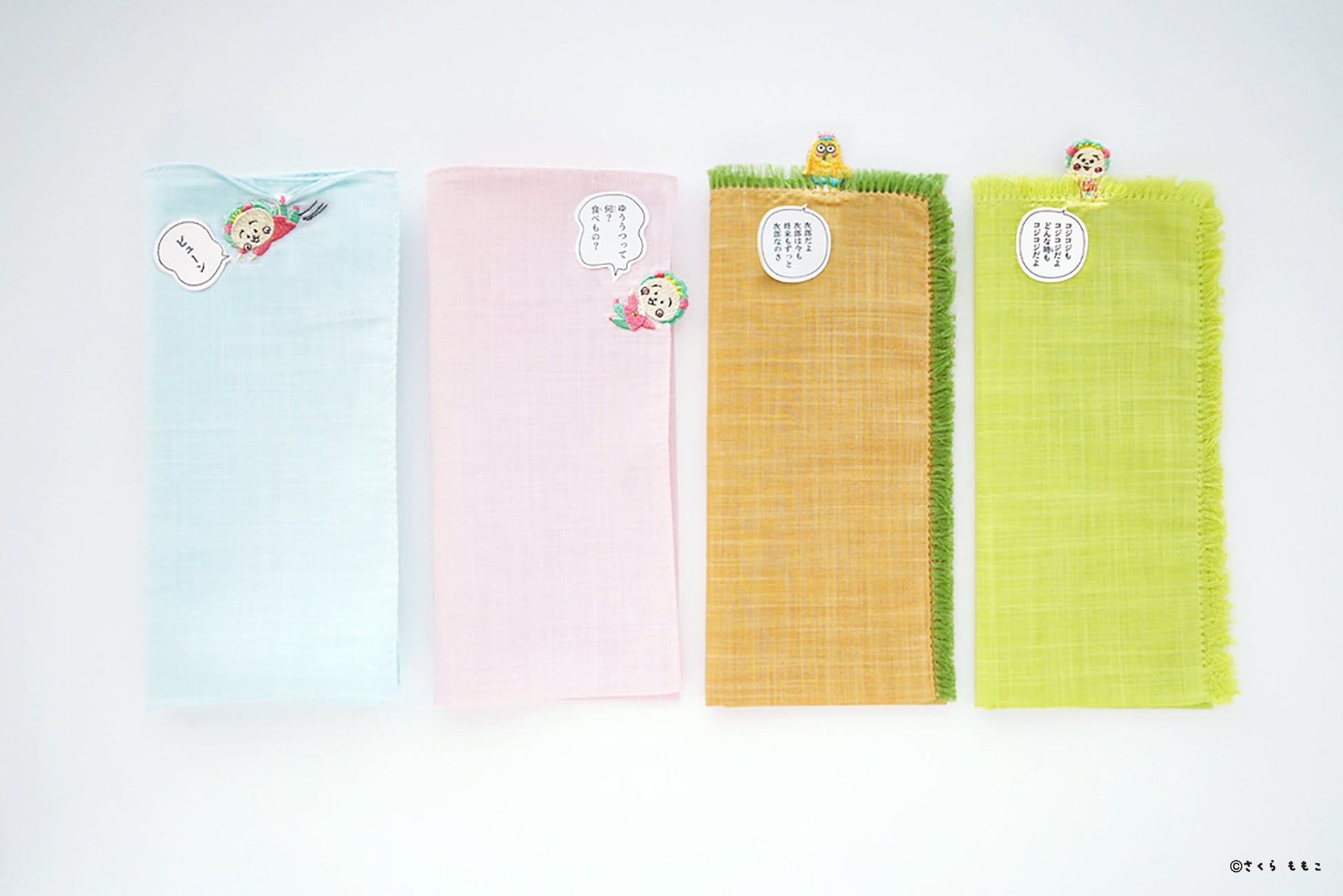 綿と麻を使用したハンカチやマイクロファイバー糸のアイテムなど、個性豊かなデザインが特徴です。