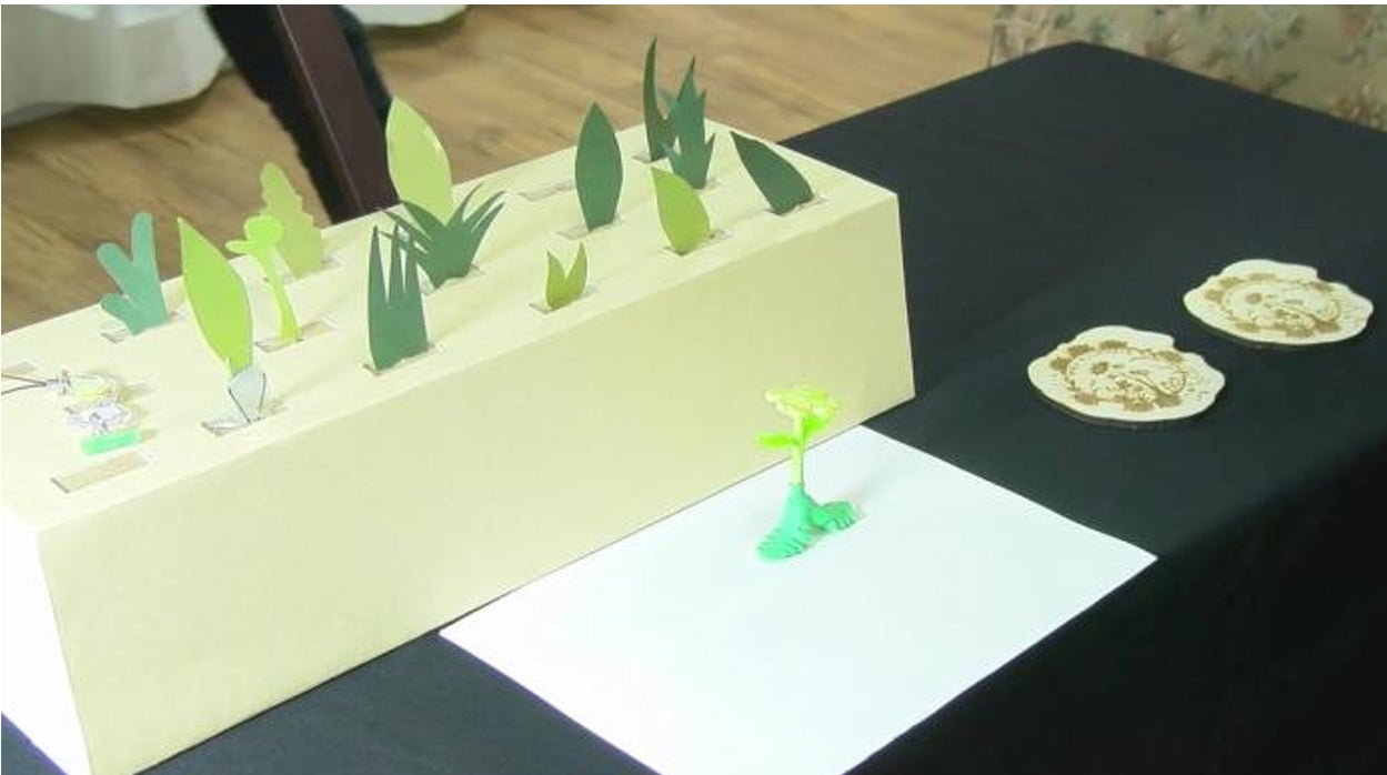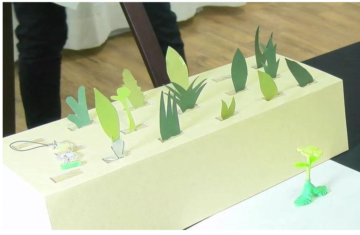 この作品は、テーマ「野草:いま、ここで生きてる」からインスピレーションを得ており、野草を引っ張ると異なる絵柄のグッズが出てくる仕掛けが施されています。