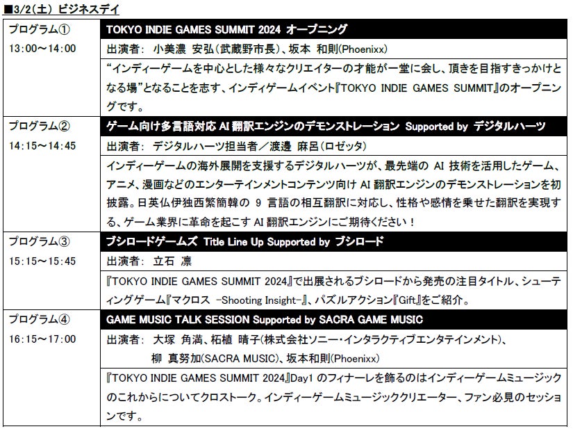 株式会社Phoenixxは、2024年3月2日(土)・3日(日)に開催されるインディーゲームイベント『TOKYO INDIE GAMES SUMMIT 2024』のステージプログラム情報と吉祥寺エリアでのイベント内容を発表しました。