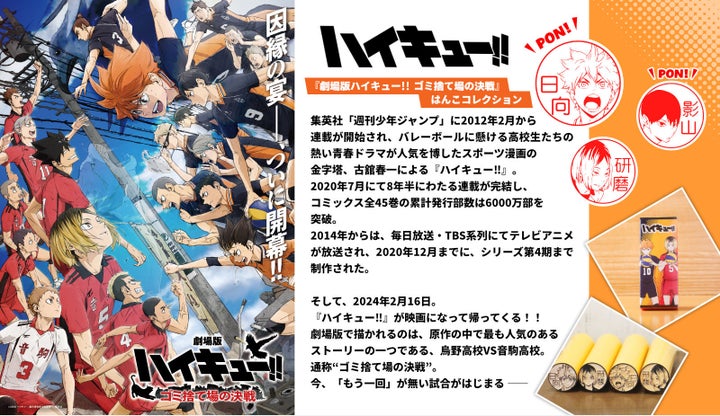 - 大阪府の株式会社岡田商会が運営する「印鑑はんこSHOPハンコズ」が、『劇場版ハイキュー!! ゴミ捨て場の決戦』に登場するキャラクター入りはんこ「劇場版ハイキュー!! はんこコレクション」の販売を開始