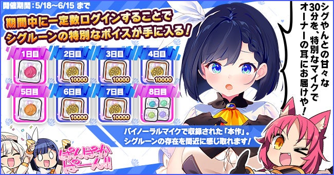 期間中、ゲームにログインすると、他では聞くことができないシグルーンとの甘々な1日を楽しむことができる録り下ろしボイスコンテンツ「おしゃべり勇者さま:トラック1~6(トラック合計32分強)」とゲーム内で使えるアイテムをプレゼントします。