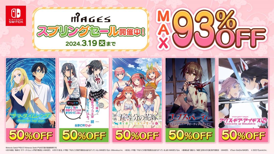 MAGES.のNintendo Switch™DLゲームがお得なスプリングセール開催中!2024年2月22日から3月19日まで、全23タイトルが最大93%オフ。