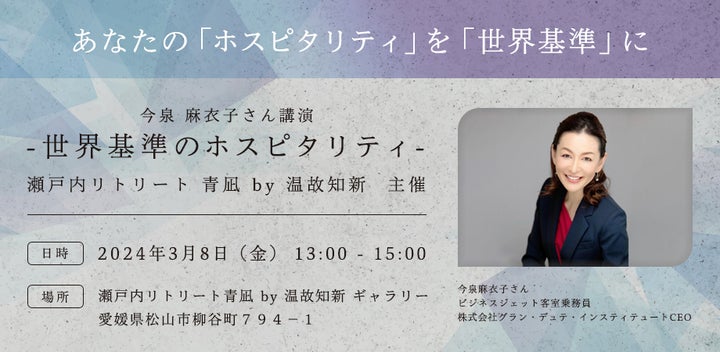 2024年3月8日、愛媛県松山市の瀬戸内リトリート 青凪で「世界基準のホスピタリティ」講演会が開催されます。