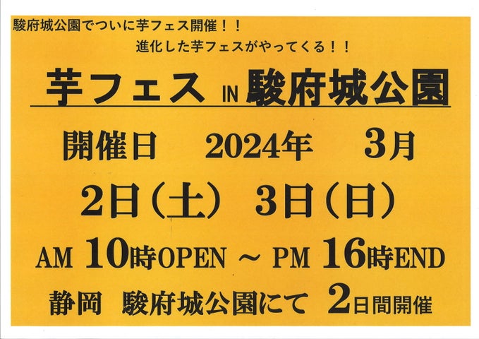 静岡駿府城公園で開催される第1回芋フェスの出店店舗が発表されました。