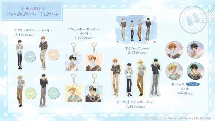 - アクリルスタンド、アクリルキーホルダー、アクリルプレート、ダイカットステッカーセット、缶バッジ、チェキ風カードセット、トートバッグ、タペストリー、ZIPパーカー