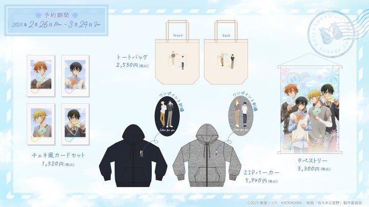 販売アイテムにはアクリルスタンド、アクリルキーホルダー、アクリルプレート、ダイカットステッカーセット、缶バッジ、チェキ風カードセット、トートバッグ、タペストリー、ZIPパーカーなどが含まれます。