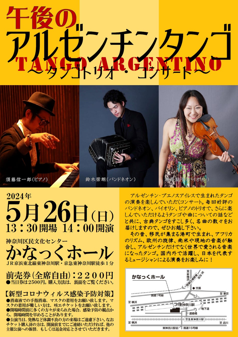 日本を代表するミュージシャンが出演し、バンドネオンの鈴木崇朗氏、バイオリンの瀬尾鮎子氏、ピアノの須藤信一郎氏が演奏します。