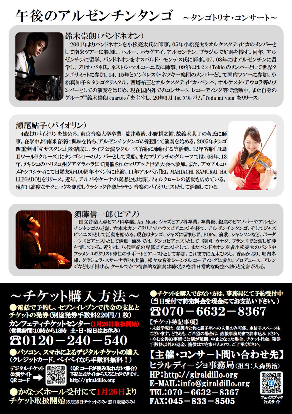 - ミュージシャン、バンドネオン、鈴木崇朗、バイオリン、瀬尾鮎子、ピアノ、須藤信一郎