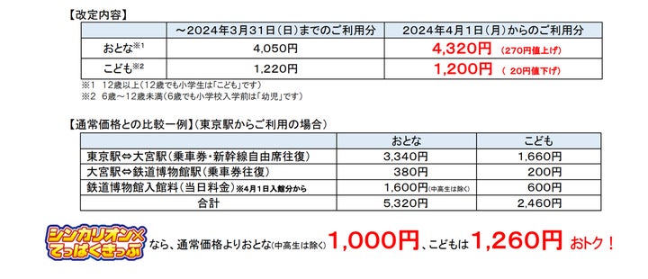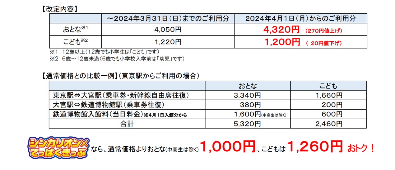 • JR在来線新幹線往復乗車券、ニューシャトル乗車券、鉄道博物館入館券含む