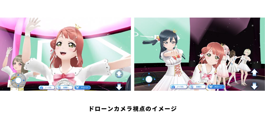 メタバースアプリ「HH cross EVENTS」で実装される新機能「ドローンカメラ」を使用することで、好きな角度と距離でパフォーマンスを楽しむことができ、会場の全体感からアーティストの表情まで、さまざまなアングルから視聴が可能です。