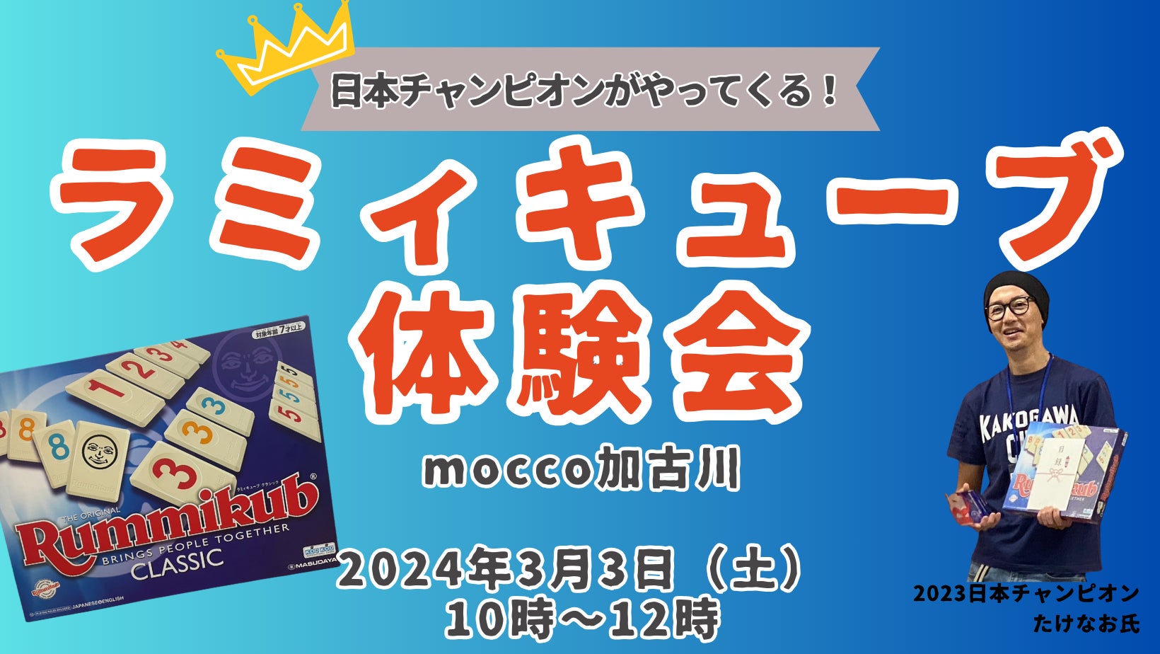 - 2023年のラミィキューブ日本選手権優勝者たけなお氏とmocco加古川で体験会開催
