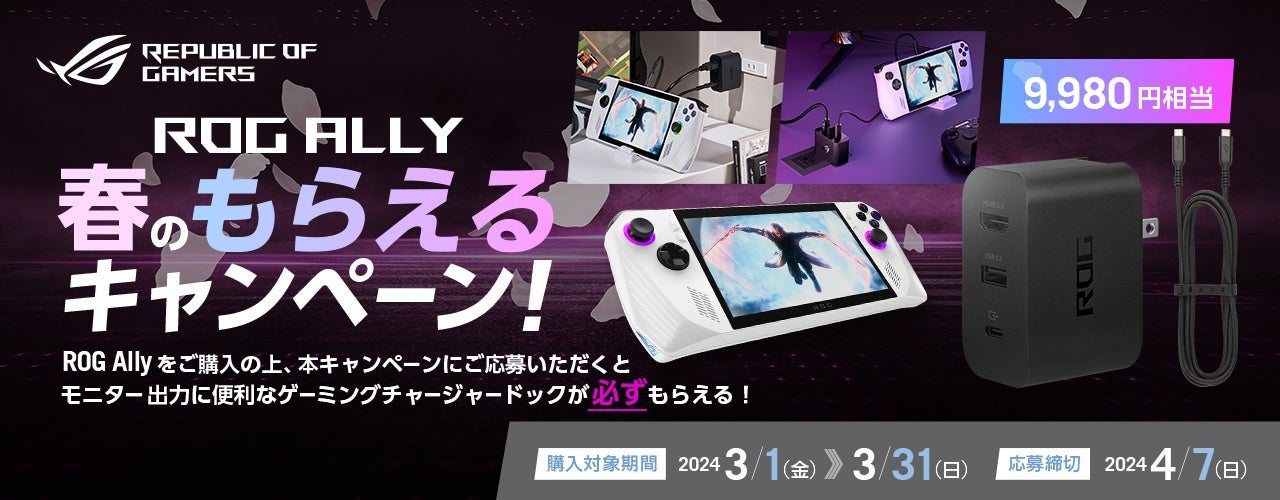 ASUS JAPAN株式会社は、3月1日から開催されるROG Allyシリーズ購入キャンペーン「#春のもらキャン」で、ROG Gaming Charger Dockをプレゼントします。