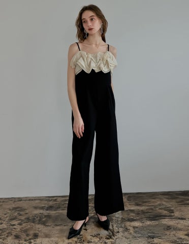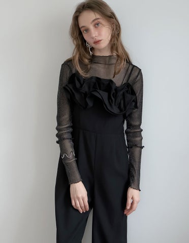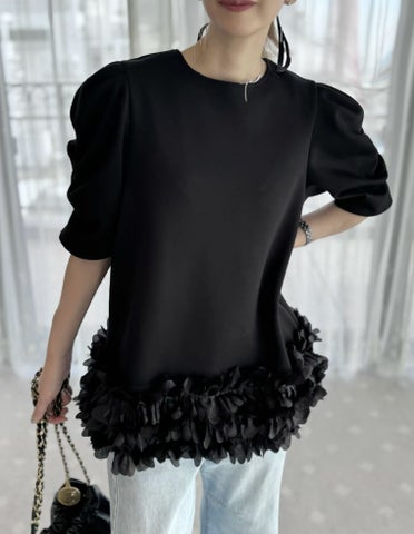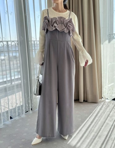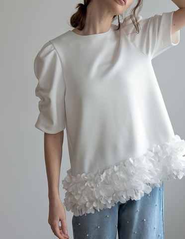 - フラワーモチーフデザインのカットソー、パフショルダーデザインのカットソートップス、異素材フリルデザインのオールインワン