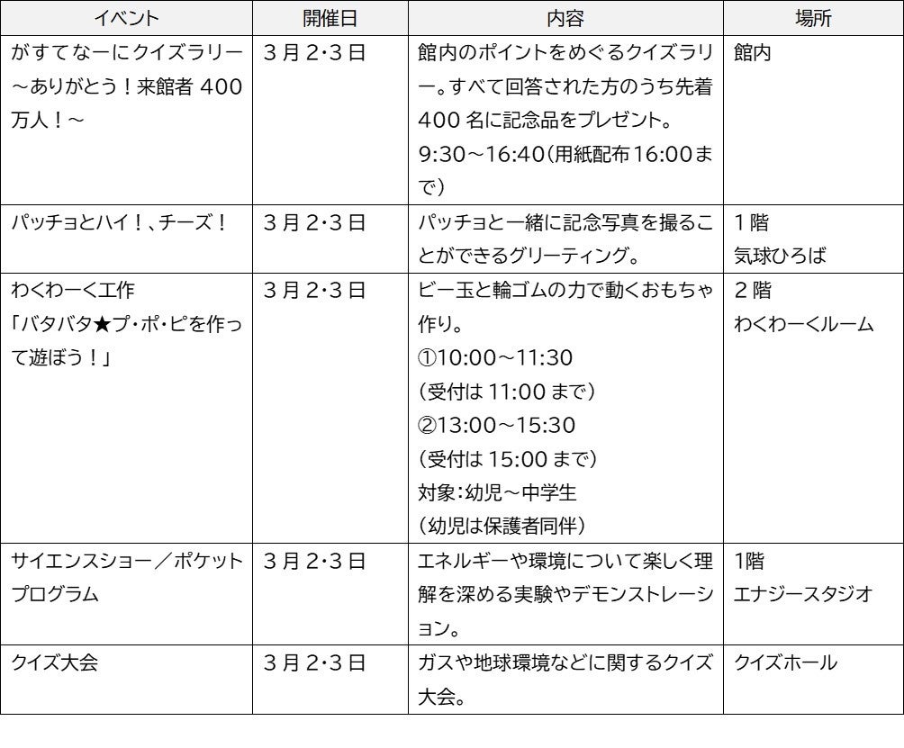 来館者400万人達成記念イベントは2024年3月2日(土)と3日(日)にがすてなーで開催され、入館料や参加費は無料です。