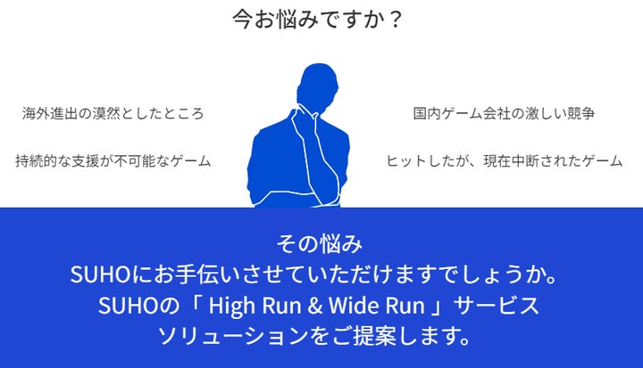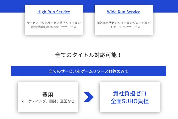 株式会社スホの「High Run&Wide Run」は、ゲーム開発・運営を支援するサービスです。