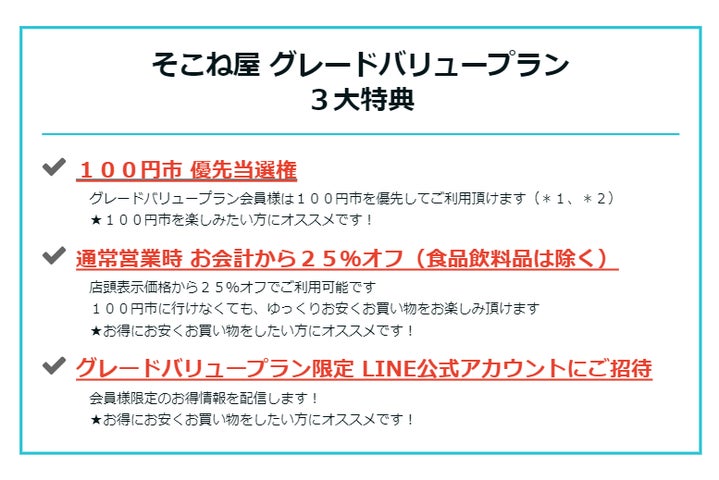 さらに、100円市への優先招待が可能な会員制度「グレードバリュープラン」がスタートしました。