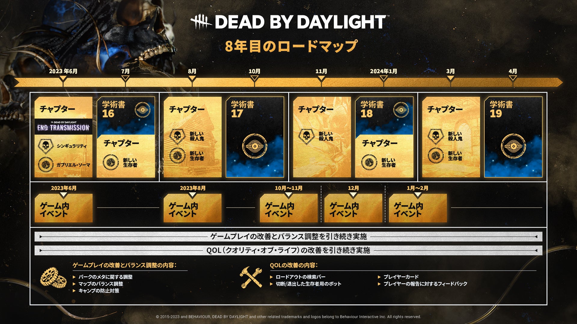 8年目には計6つのチャプターが登場予定で、SFホラーをテーマにした新チャプター「通信終了」では、新マップ「Toba Landing」が登場し、新キラー「The Singularity」と新サバイバー「Gabriel Soma」が追加される。