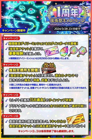 1周年記念後夜祭キャンペーンも同時開催で、豪華な報酬や復刻交換所が用意されています。