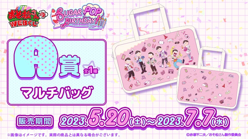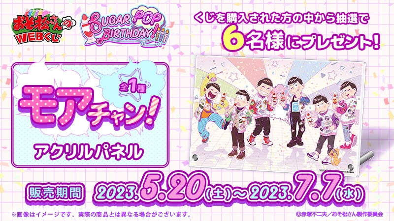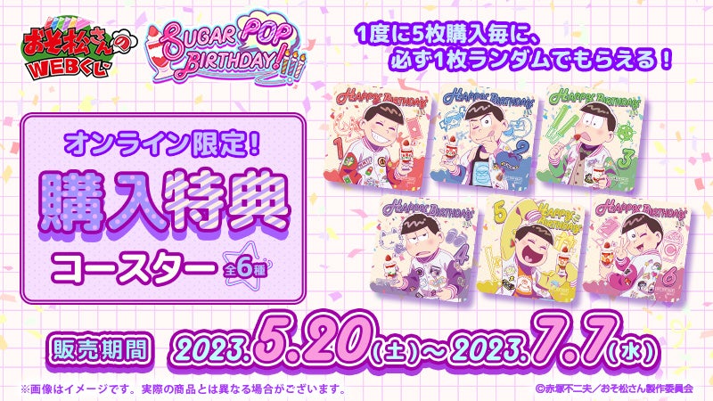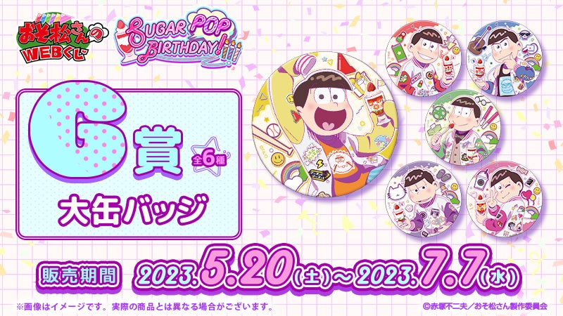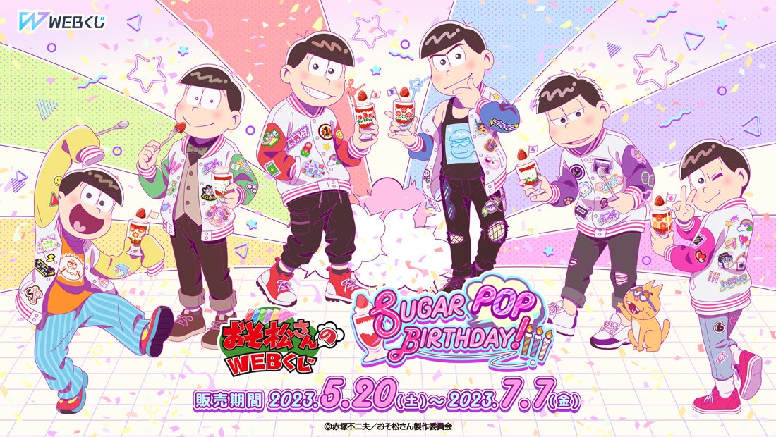 「おそ松さんのWEBくじ第18弾『SUGAR POP BIRTHDAY!』」が、6つ子の誕生日をテーマにした描き下ろしイラストを使用したグッズが当たるくじとして、全国52店舗で店頭&オンラインくじサイト「WEBくじ」にて販売中。