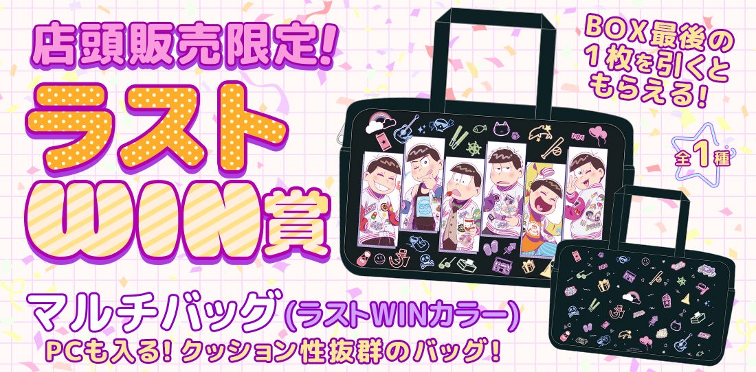 賞品ラインナップには、マルチバッグやタペストリー、アクリルスタンド、オーロラアクリルキーホルダー、クリアファイル&ステッカーセット、大缶バッジなどがあり、店頭にお越しのお客様には、6つ子のスペシャルメッセージが書かれたポストカードをくじ5枚購入ごとに配布される。