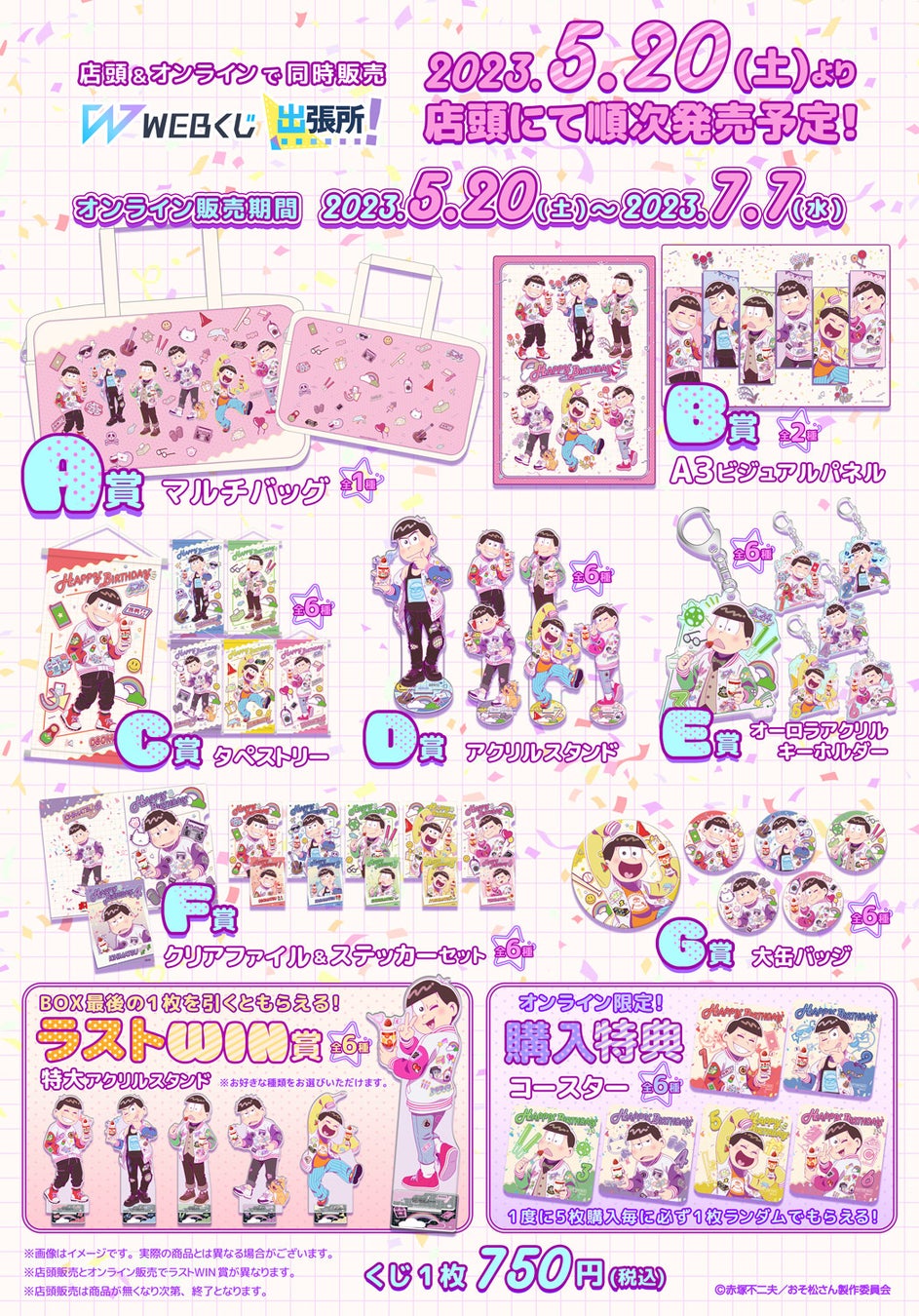 6つ子たちの誕生日を記念して、全国52店舗で店頭&オンラインくじサイト「WEBくじ」にて販売中です。