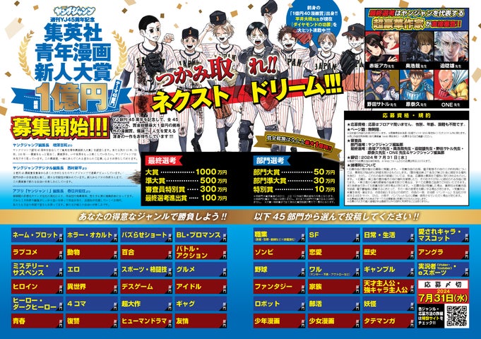 - 青年漫画新人大賞:賞金総額1億円、応募締め切りは7月31日