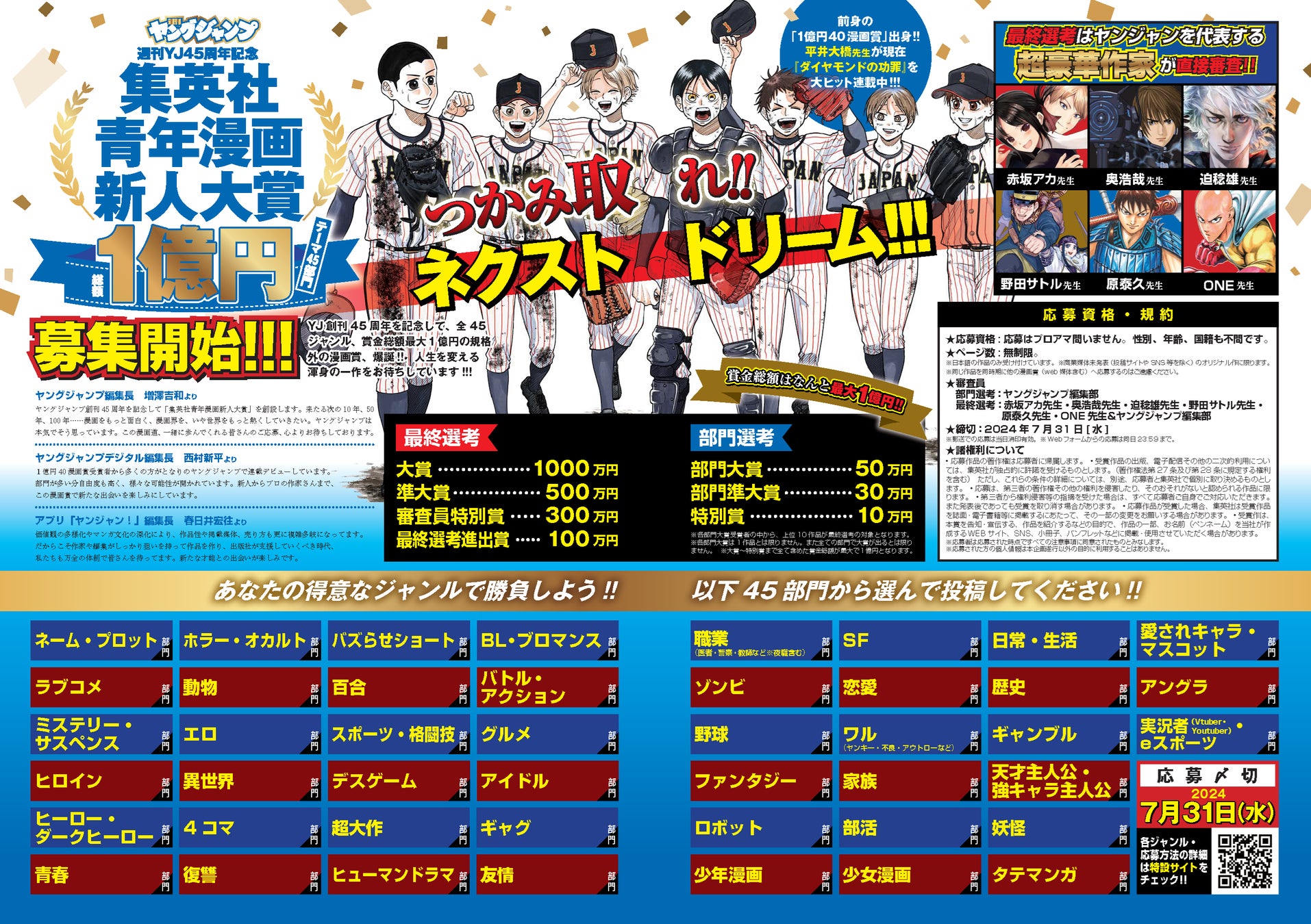 週刊ヤングジャンプは青年漫画誌として幅広いジャンルの話題作を生み出しており、45周年を記念して新人漫画賞を開催します。