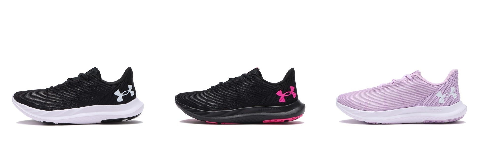 商品紹介ではUA CHARGED SPEED SWIFTとUA ESSENTIALの特徴、価格、カラーバリエーションが紹介されています。