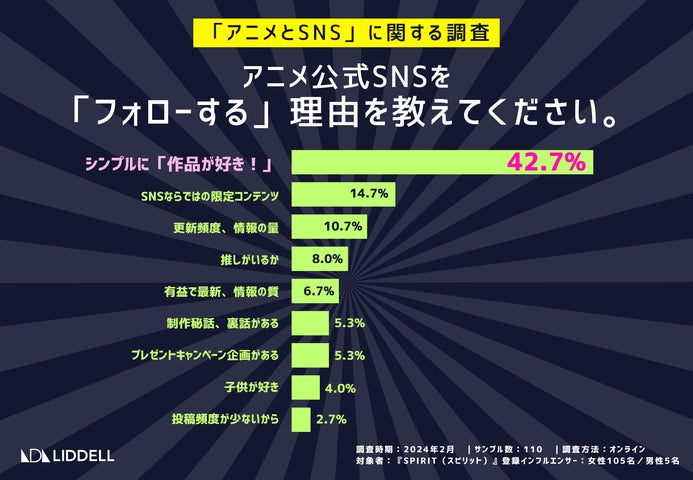アニメ公式SNSをフォローする理由は「作品が好き」が最も多いですが、SNS限定の情報や推しキャラ、グッズ情報なども人気です。