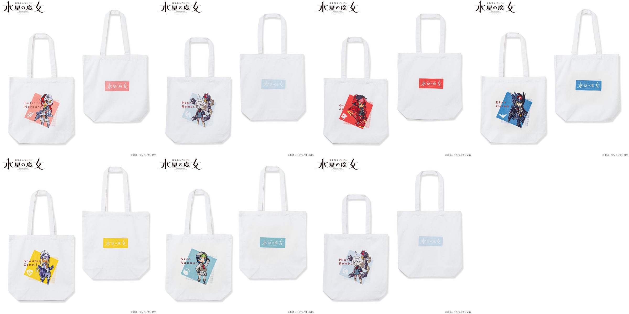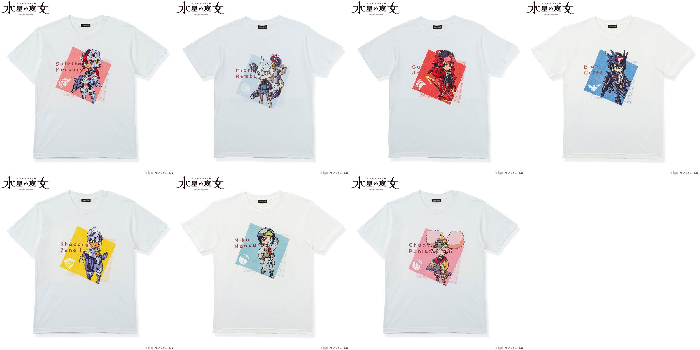 半袖Tシャツ、トートバッグ、フェイスタオル、クッション、たためるトートバッグ、シャカシャカポーチの全6種類があり、キャラクターラインナップは「ミオリネ」「スレッタ」「グエル」「エラン」「シャディク」「ニカ」「チュチュ」。