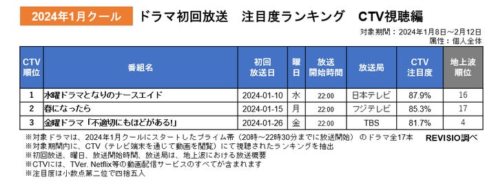 REVISIO株式会社が2024年1月にスタートした冬ドラマの初回放送でのCTV注目度ランキングTOP3を発表しました。