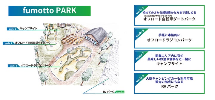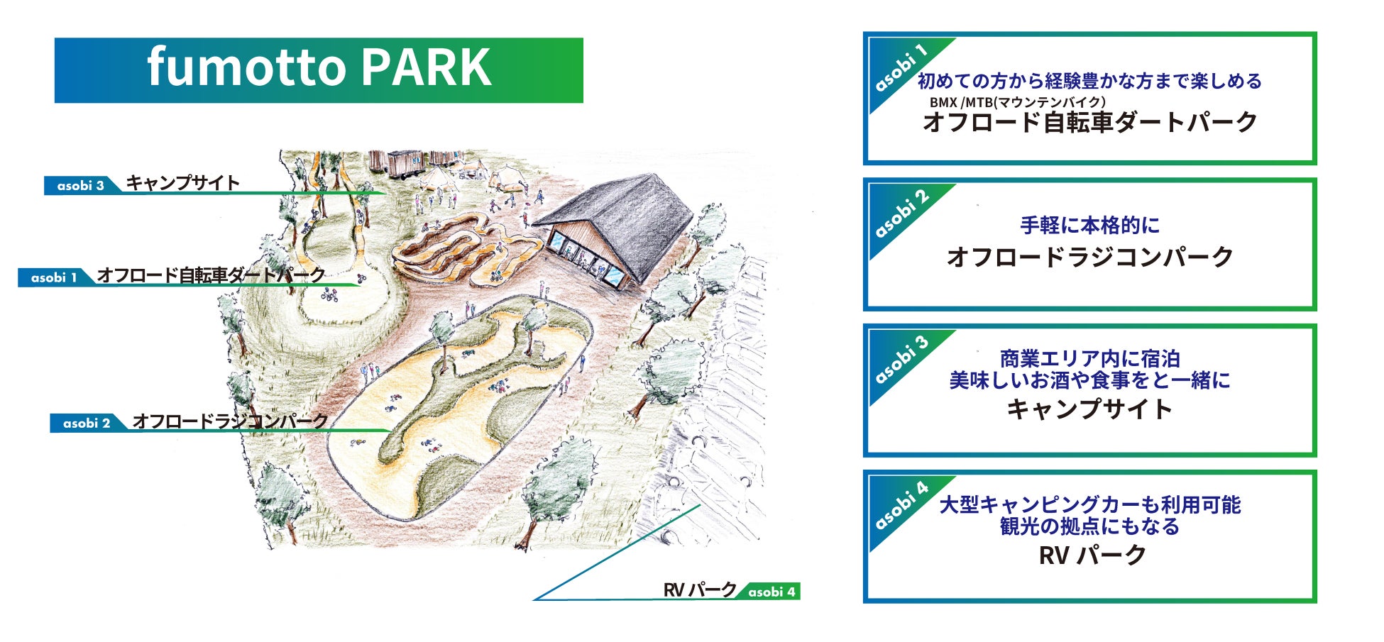 施設にはMTB&BMXパーク、ラジコンパーク、キャンプサイト・RVパークがあり、初心者から経験者まで楽しめるコース設計やキックバイクパークも予定されています。