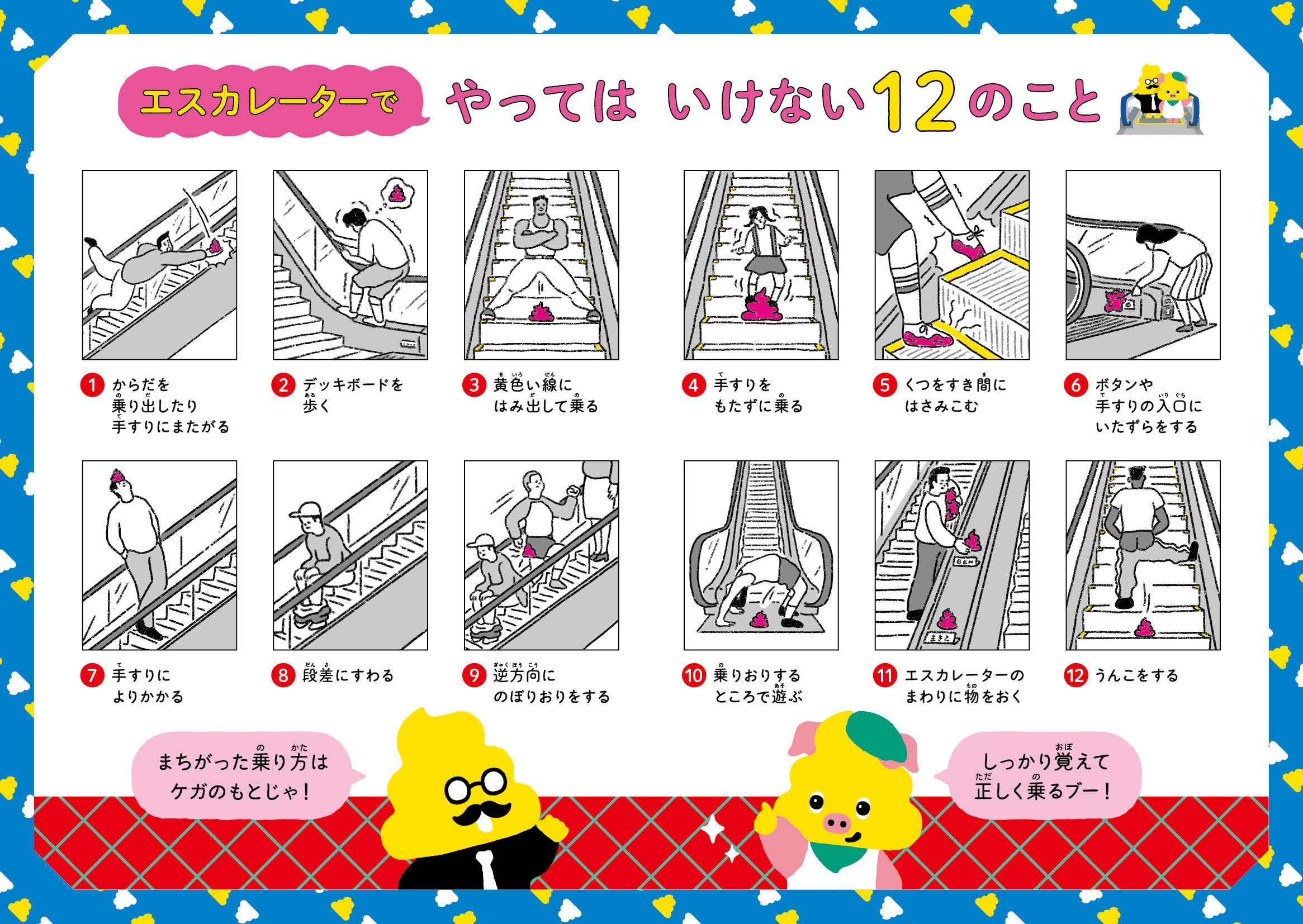 冊子の巻末には「エスカレーターでやってはいけない12のこと」というコンテンツが。すべての項目でうんこを描きこんだイラストにクスッと笑いながら、エスカレーターで何をしてはいけないのかを、しっかりと記憶にとどめることができます。