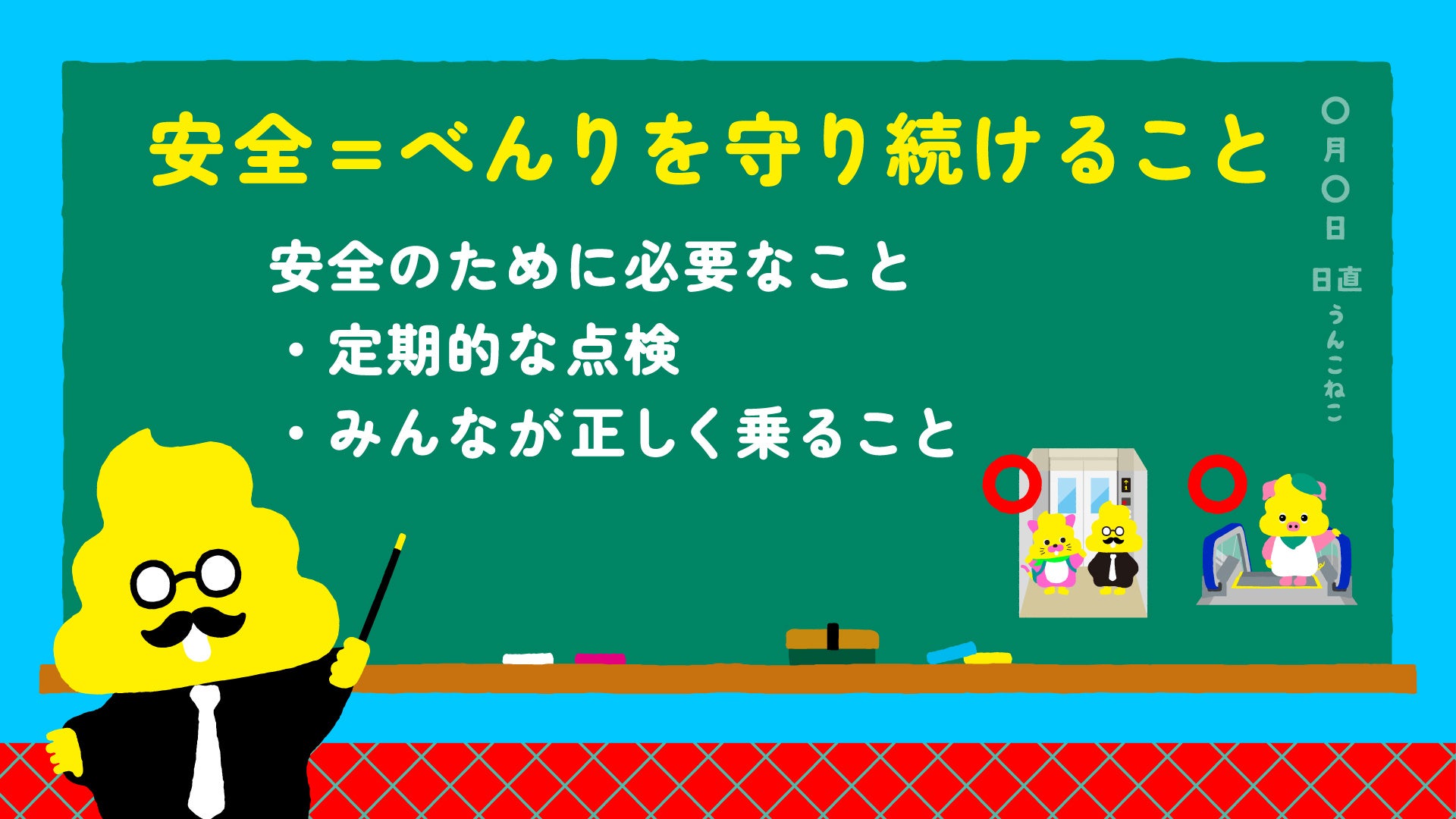 冊子とともに制作した動画では、うんこ先生が出題する全2問のクイズに答えることで、日ごろの便利を支えているエスカレーターの安全のためには、定期的な点検と利用者が正しく乗ることがどちらも大切であることが学べます。