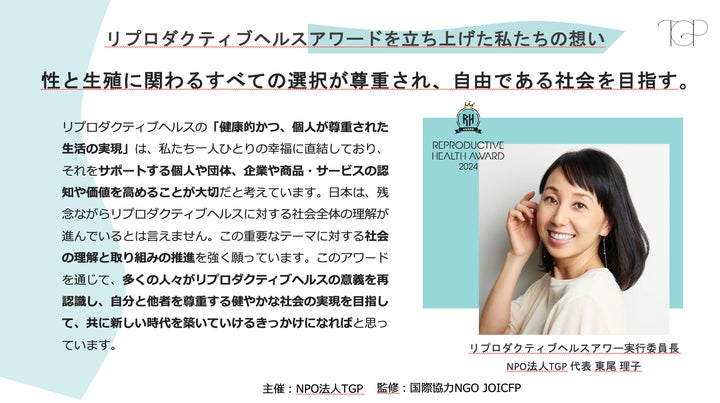 - NPO法人TGPがリプロダクティブヘルスアワードを主催