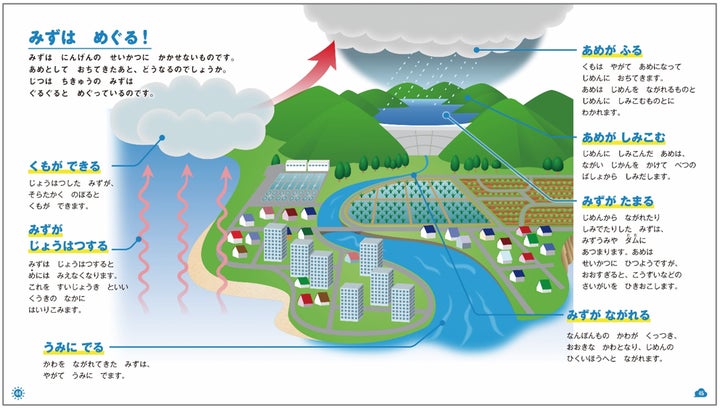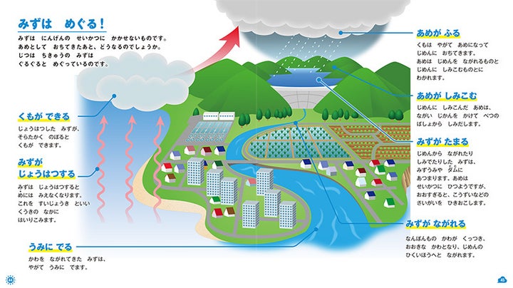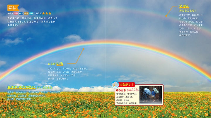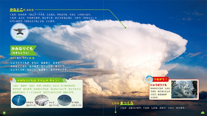 『はじめてのずかん そら・てんき』は、天気を「くも」「あめ」「ゆき・こおり」「ひかり」「かぜ」の5つに分類し、季節ごとの天気やその変化、関連する天気のつながりを大きな写真やイラストでわかりやすく解説しています。