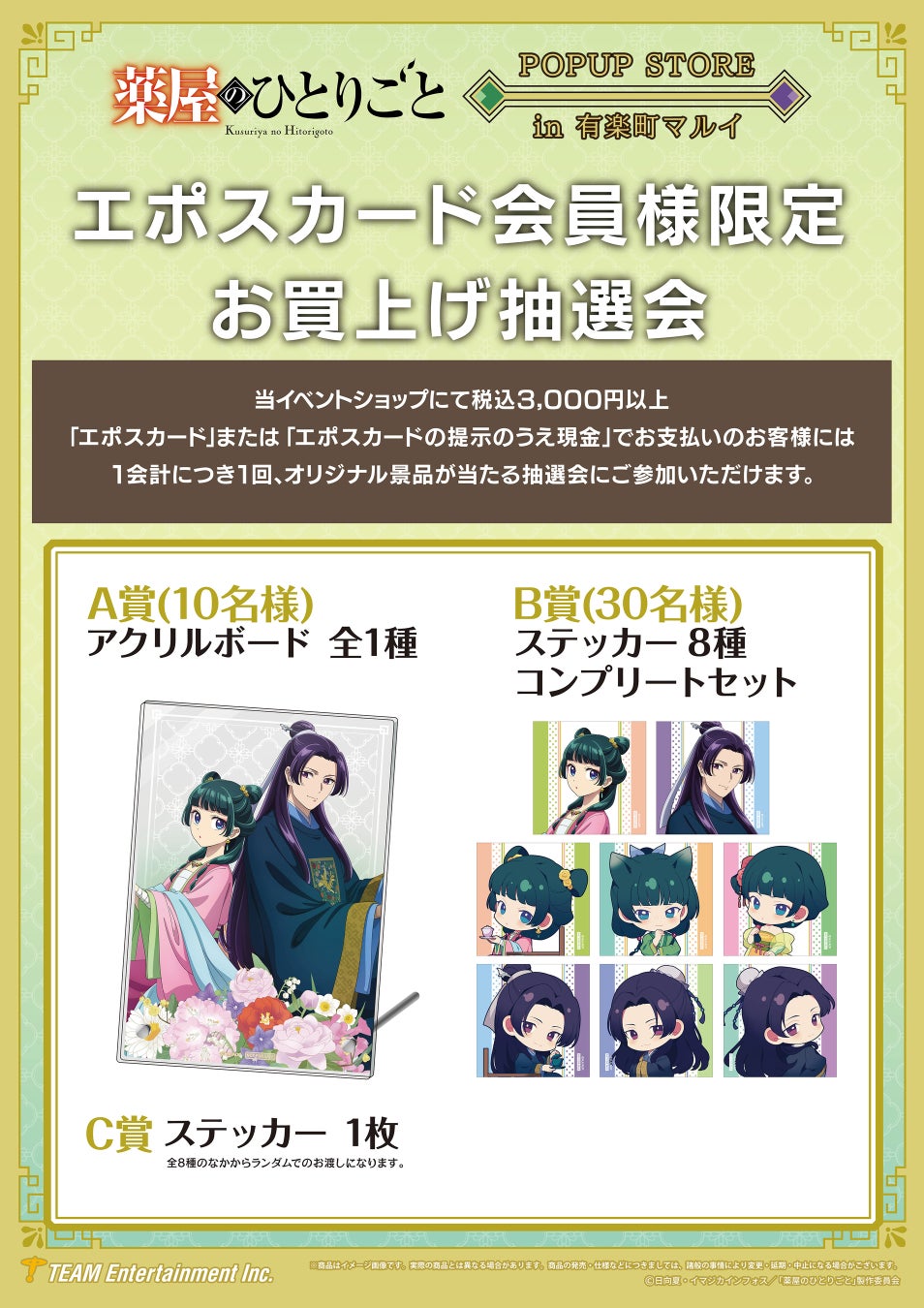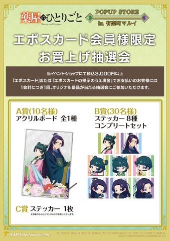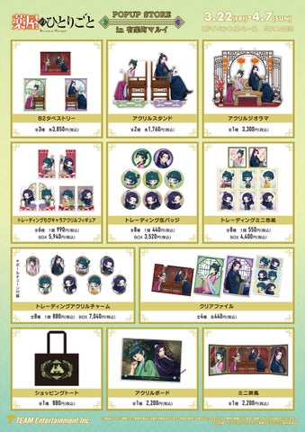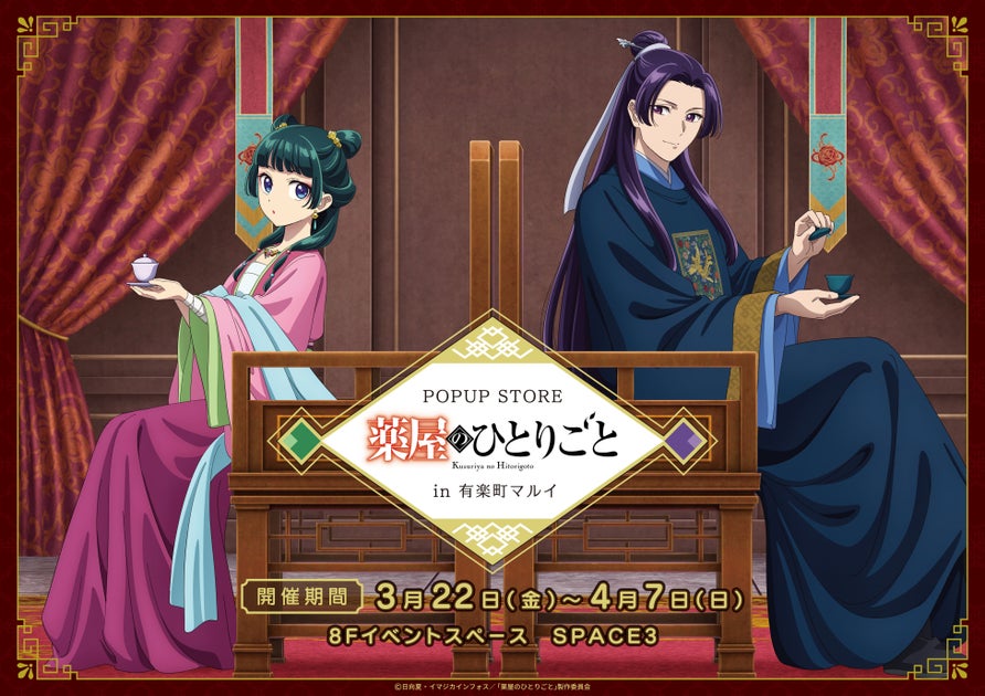 TVアニメ『薬屋のひとりごと』のポップアップストアが有楽町マルイ8Fで期間限定開催中!園遊会衣装の猫猫と壬氏の描き下ろしイラストや、ちびキャライラスト入りの新作グッズが豊富。