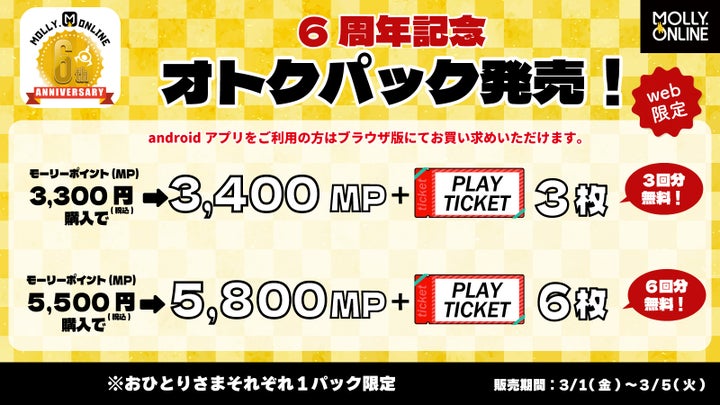 モーリーオンラインでは、期間限定でお得な「プレイチケットつきオトクパック」を2種類販売します。