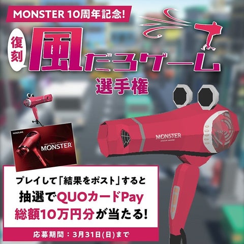 小泉成器株式会社は、大風量ドライヤー「MONSTER」の10周年記念として、「風だろ!ゲーム選手権」を開催します。